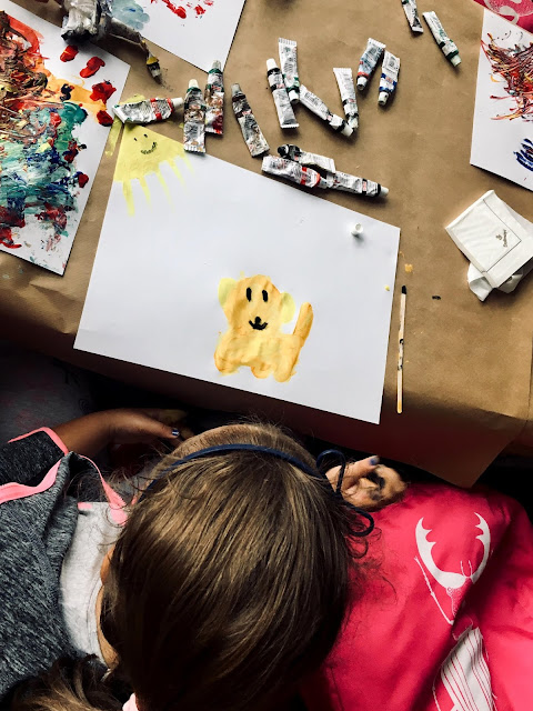 Tematem pierwszych zajeć w Tygodniu Farby była Radość oraz malarstwo patyczkami i rączkami. Emocje są dobrym zadaniem dla małego dziecka, dzięki czemu nie musi koncentrować się na usiłowaniu namalowania konkretnego wizerunku (postaci etc), tylko skupić się na formie, fakturze i kolorze. Tego dnia powstało mnóstwo cudownych prac, abstrakcyjnych i artystycznych!